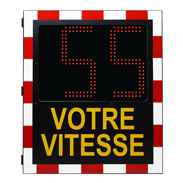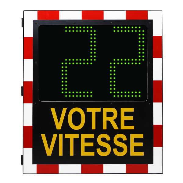 Affiche la vitesse des véhicules en continu en dessous de la vitesse maximale autorisée et en clignotant au dessus de la vitesse maximale autorisée.
